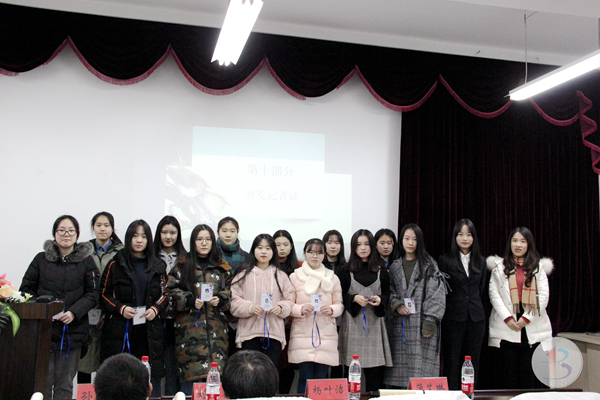 最后,由商学院新闻中心指导老师蒲艾琳和新闻中心主任王怡文为新干事代表们颁发记者证,并由蒲艾琳老师上台发表总结感言。蒲老师表示,在过去的一年里,商学院新闻中心的工作增加了微信平台的运营,这是一个全新的挑战,但干事们能保质保量完成任务,且新闻报道的速度和质量都得到了分院老师的肯定,作为指导老师对大家的表现感到非常自豪。